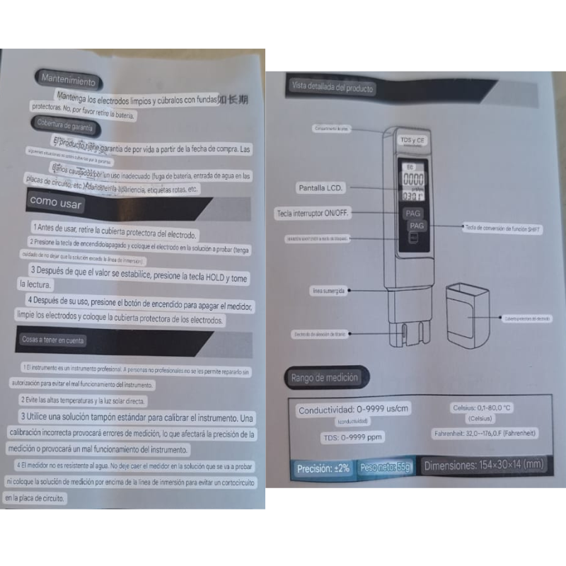 Vas a poder usarlo como medidor tds agua osmosis, medidor tds piscina, medidor de sal en agua, medidor de ppm para agua, e incluso como medidor de salinidad del agua en tanques o sistemas de riego. También cumple funciones de medidor de ec tds, medidor tds ppm, medidor de salinidad digital y medidor de particulas en el agua.