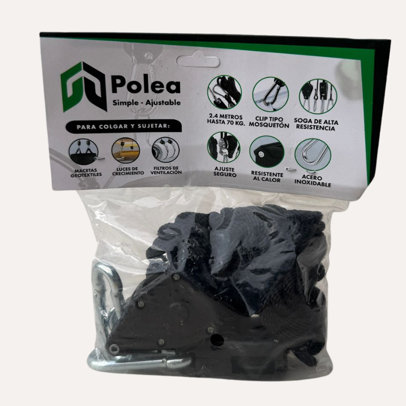 Las Poleas son el accesorio ideal para regular la altura de tus luces y equipos en tu cultivo indoor. Diseñadas para facilitar el ajuste rápido y preciso, estas poleas aseguran un posicionamiento óptimo de tus luminarias, mejorando la eficiencia lumínica y el crecimiento de tus plantas. Además, son resistentes y soportan el peso de equipos como luces, filtros y extractores.